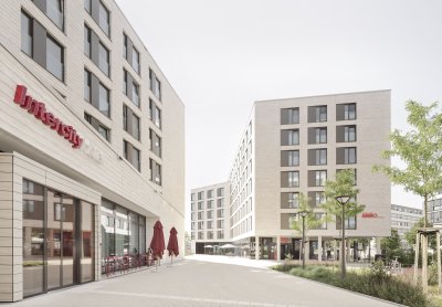 Am Hauptbahnhof Heidelberg entstanden ein Hotel und ein Boardinghaus. Der ausgewählte Standort zeichnet sich in besonderer Weise durch das Zusammentreffen von Fern- und Nahverkehr, ÖPNV und Individualverkehr aus. Die prominente Lage am zukünftigen Stadtbalkon mit direkter Verbindung zum Hauptbahnhof Heidelberg ist wesentlich. Die beiden neuen Häuser werden zusammen mit dem Hauptbahnhof als Ensemble im Sinne eines einheitlichen Stadtbausteins begriffen. In der gemeinsamen Typologie der polygonal geformten Baukörper mit Lochfassade und einer durchgängigen Farbigkeit wird ein verbindendes Grundthema gesetzt. Dabei ist die Gestaltung betont zurückhaltend und erscheint durch elegante Einfachheit zeitlos und selbstverständlich.